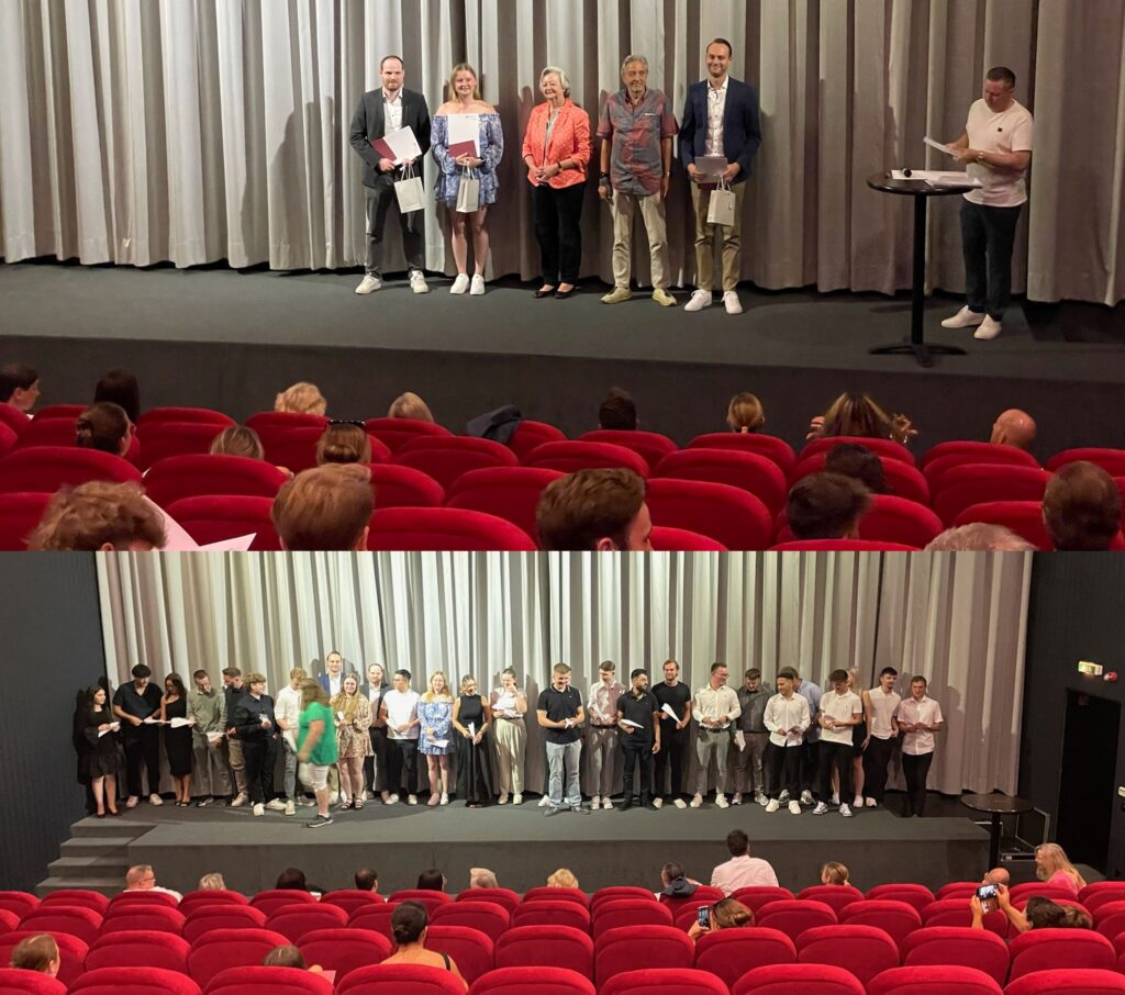 Am 01.07.2025 fand trotz Hitze und spontaner Bombenräuming in der Osnabrücker Innenstadt die Lossprechungsfeier für Kaufleute für Spedition und Logistikdienstleistung des KNI e.V. im Cinema Arthouse statt. Gemeinsam mit der BBS Pottgraben wurde durch ein vielfältiges Programm geführt. Nach einer musikalischen Einlage am Klavier durch die Kreismusikschule Osnabrück folgte die Zeugnisübergabe, die Ehrung der Jahrgangsbesten und die emotionale Abschlussrede der ehemaligen Azubis. Ein sportlicher Impuls mit dem Gesundheitscoach Patrick Jochmann mit Tipps für Gesundheit am Arbeitsplatz rundete die gelungene Veranstaltung ab. Abschließend gab es für alle Auszubildenden ein KNI-Frühstücksbrett und hochwertige Müslibecher to Go, damit der Start ins Berufsleben voller Energie starten kann.