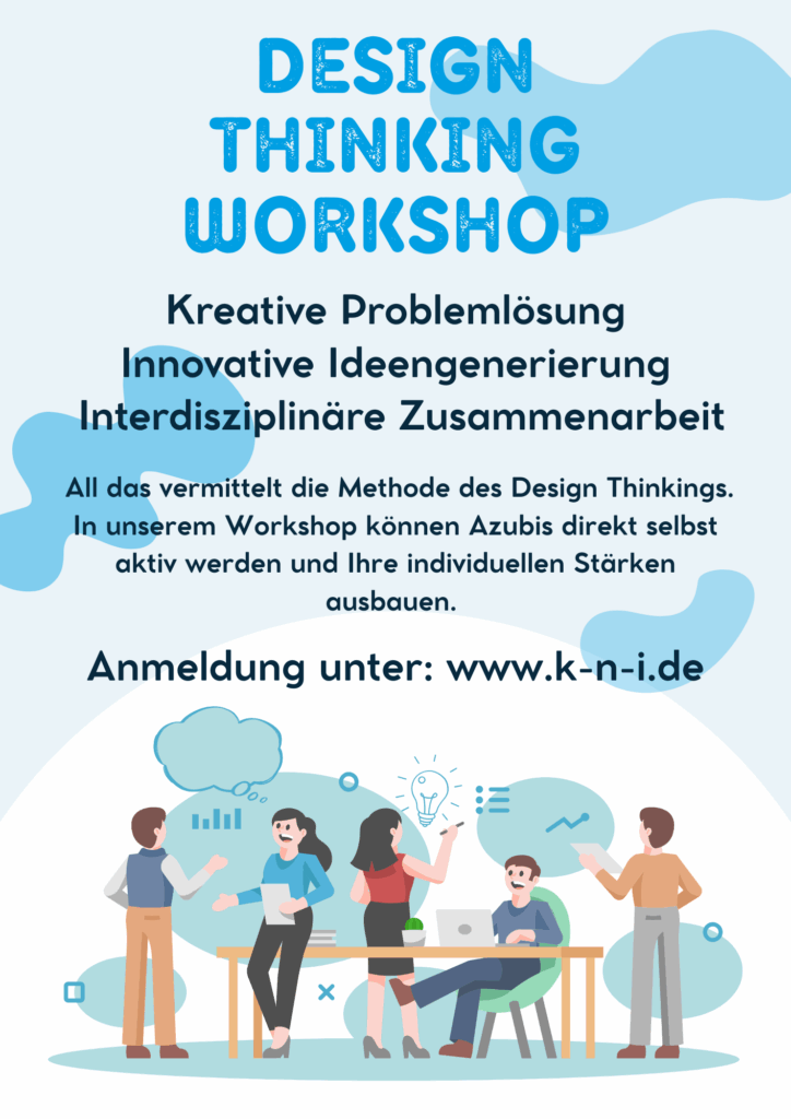Am 30.10.2025 bietet die KNI Akademie von 8:30-16:30 Uhr einen Design Thinking Workshop für Azubis an. Während der ganztägigen Veranstaltung durchlaufen alle Teilnehmenden den Design Thinking Prozess von Anfang bis Ende und haben die Möglichkeit selbst aktiv zu werden. Das Design Thinking fördert nicht nur kreative Problemlösung und innovative Ideengenerierung dank „um die Ecke denken“, sondern stärkt auch interdisziplinäre Zusammenarbeit. Individuelle Stärken werden gefördert und helfen den Teams ganzheitliche Lösungsansätze zu entwickeln.